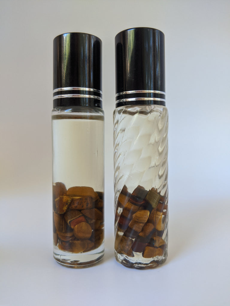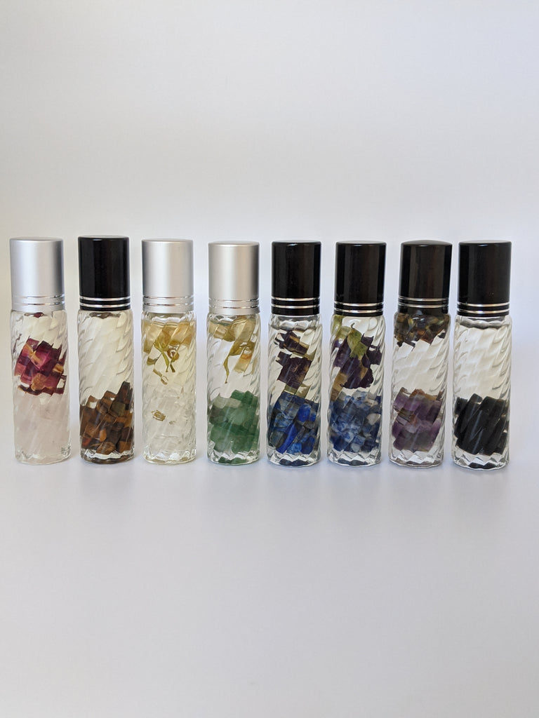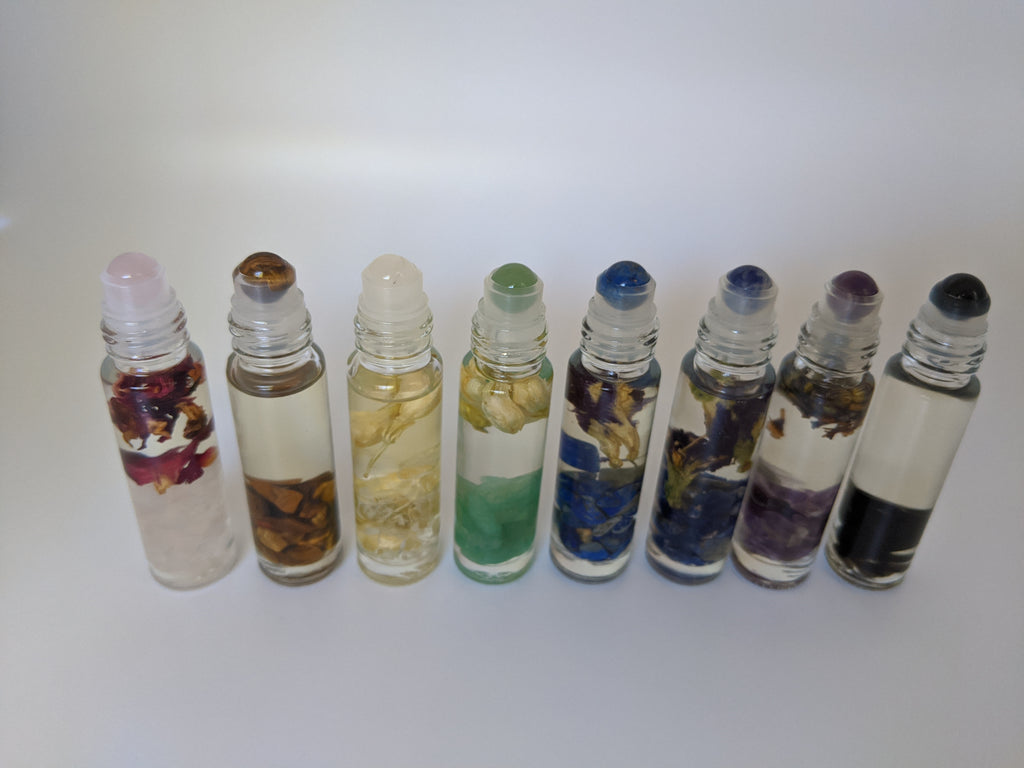 Our roller perfumes are individually bottled and fragrances curated and created specifically for each aesthetic. In general, we most commonly carry 5mL and 10mL glass roller bottles specifically designed for fragrance and essential oil contents. Each one has complementing natural stones to act as mixers! Strawberry quartz, aquamarine, citrine, and tourmaline, etc. may all be used and are specific to each fragrance or even batch.